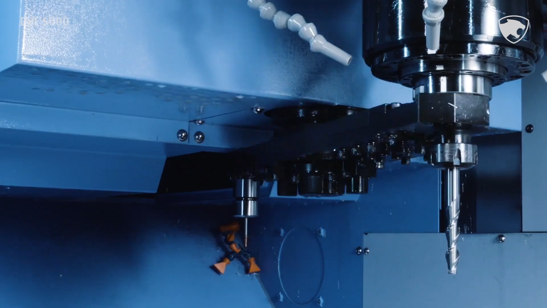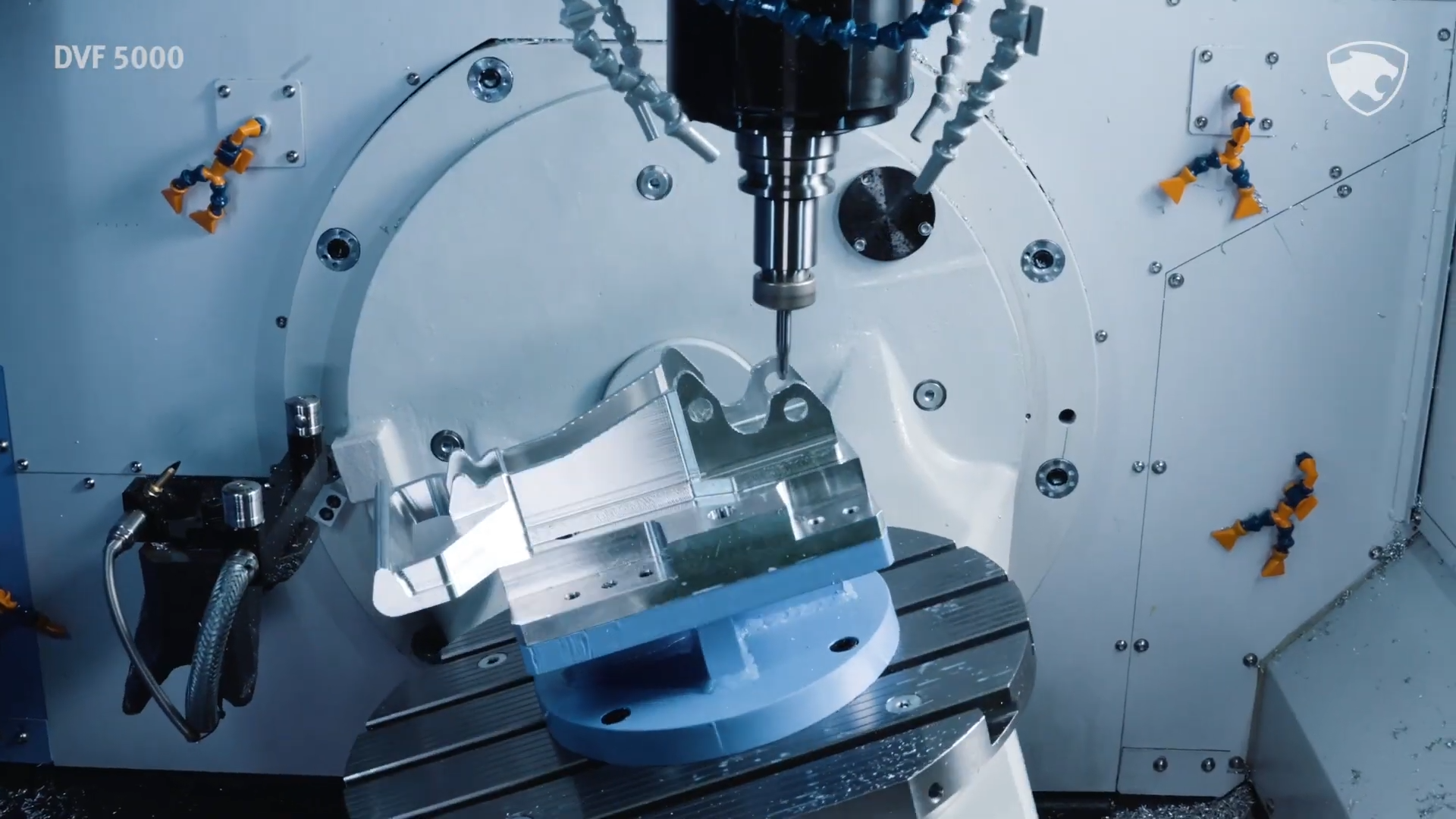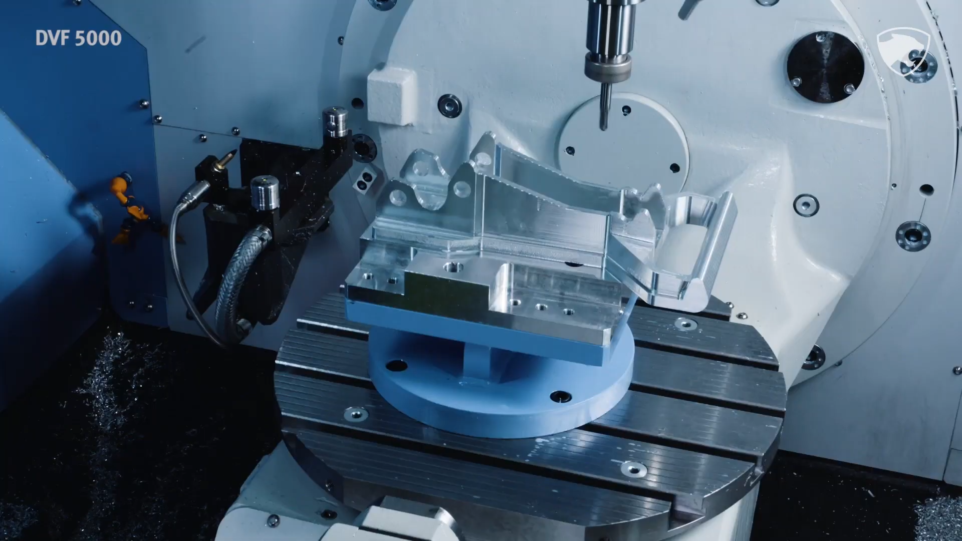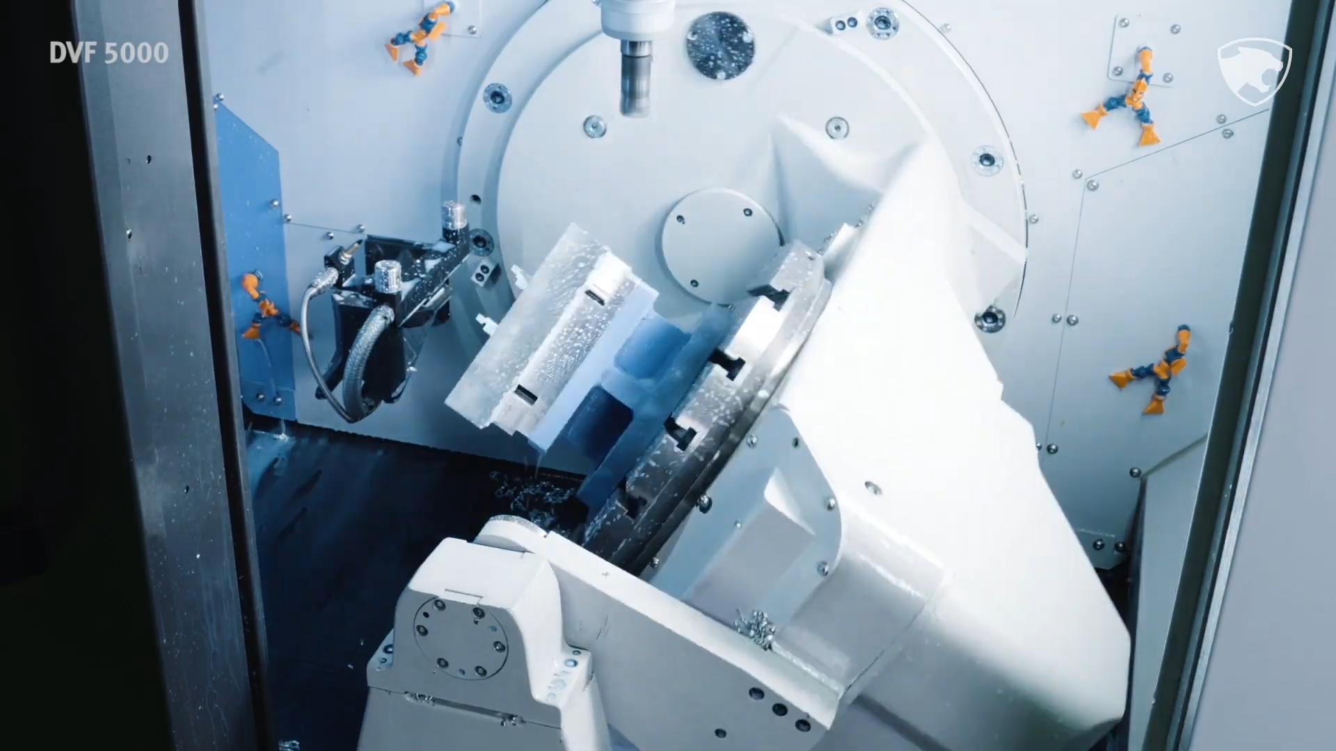 Высокая точность 5-осевой обработки: Наклонно-поворотный стол (оси B и C) с прямыми торк-моторами и разрешением 0.0001° позволяет создавать сложнейшие геометрии без переустановки заготовки.
