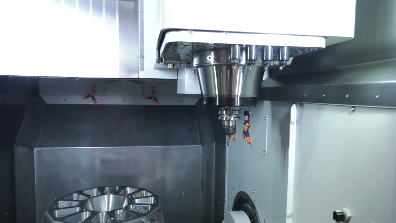 Интегрированный наклонно-поворотный стол (оси A и C) с прямыми приводами и разрешением 0.0001° позволяет выполнять непрерывную пятиосевую обработку без переустановки заготовки. Это обеспечивает идеальное сопряжение поверхностей и сокращает вспомогательное время.