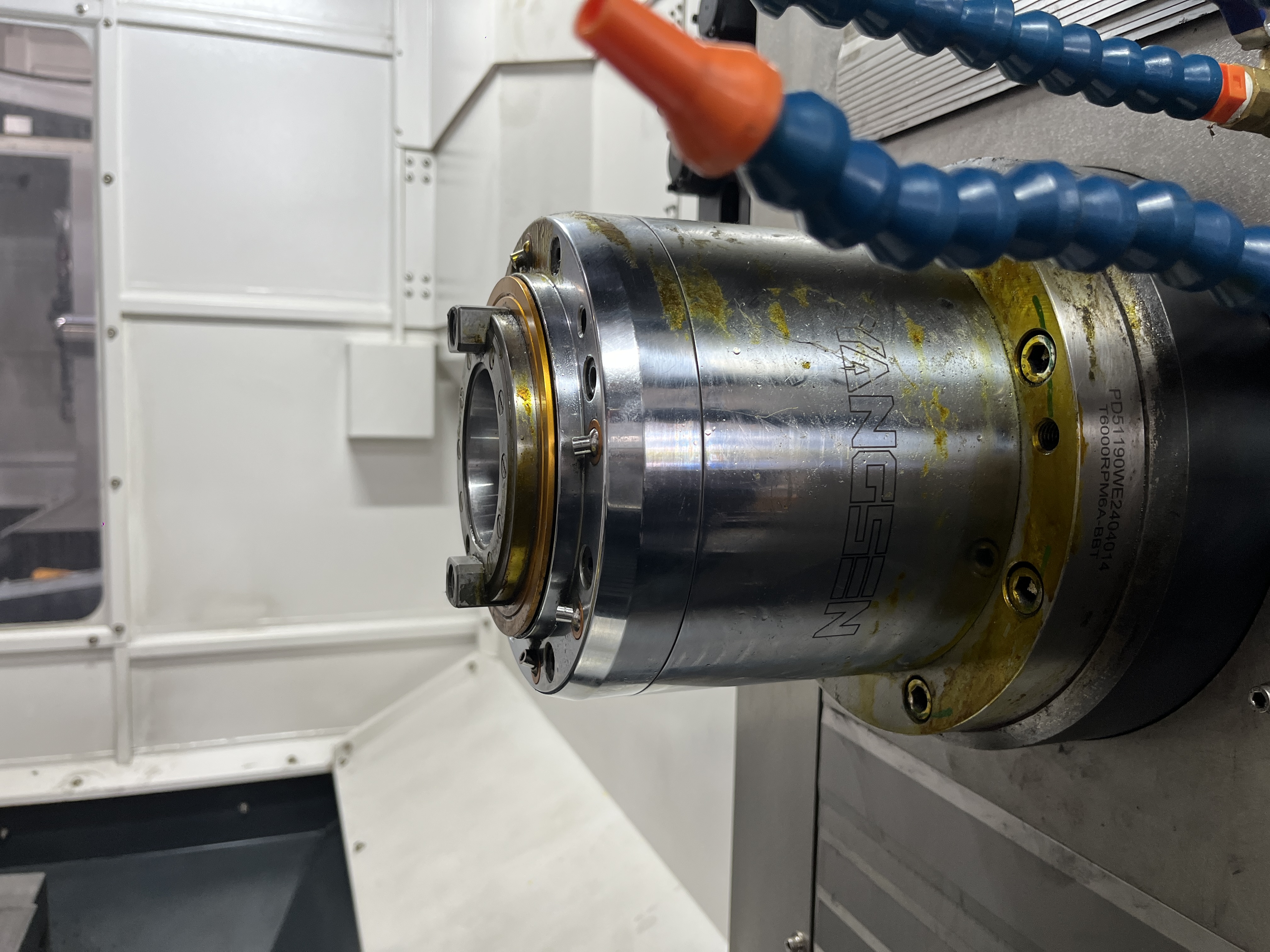 Поворотный стол фиксируется четырьмя опорами, обеспечивая надежное закрепление под нагрузкой. Точность деления составляет 0.001°, позволяя обрабатывать детали под любым углом.