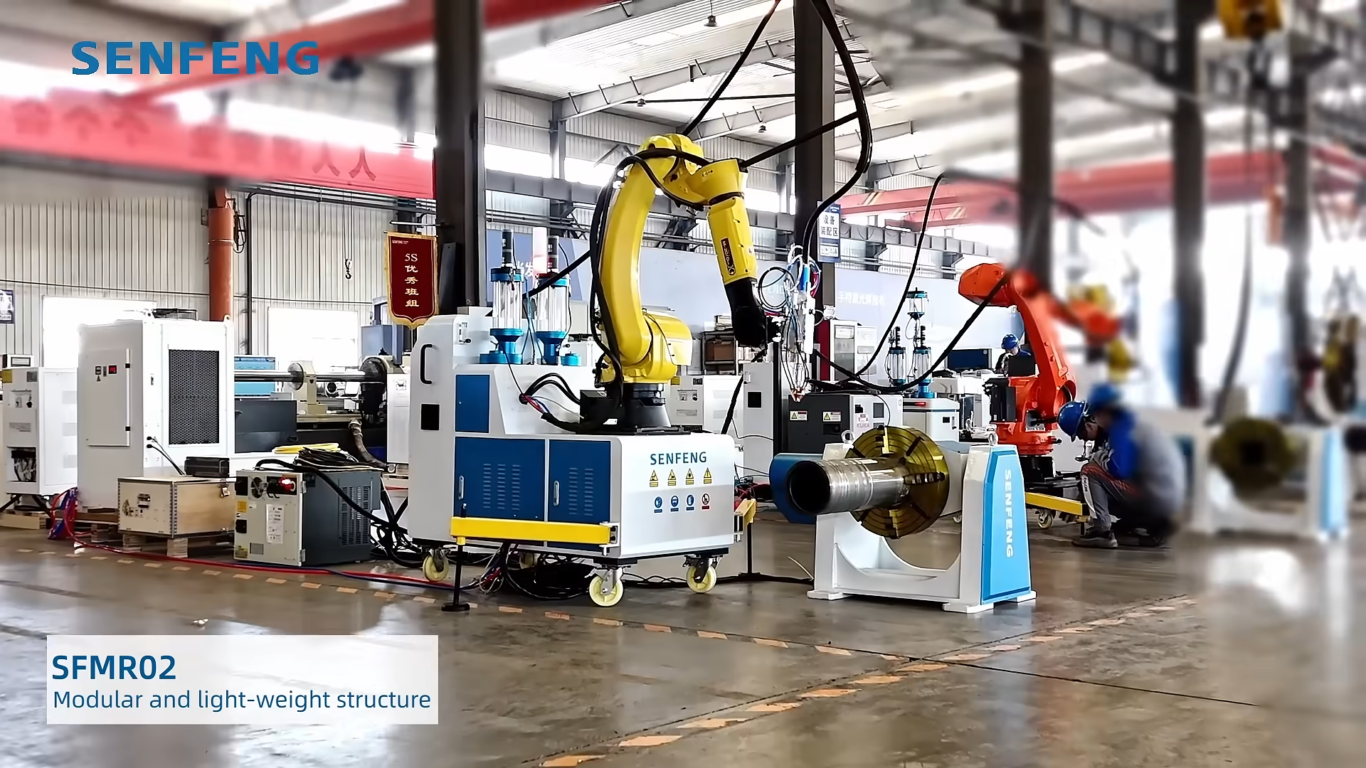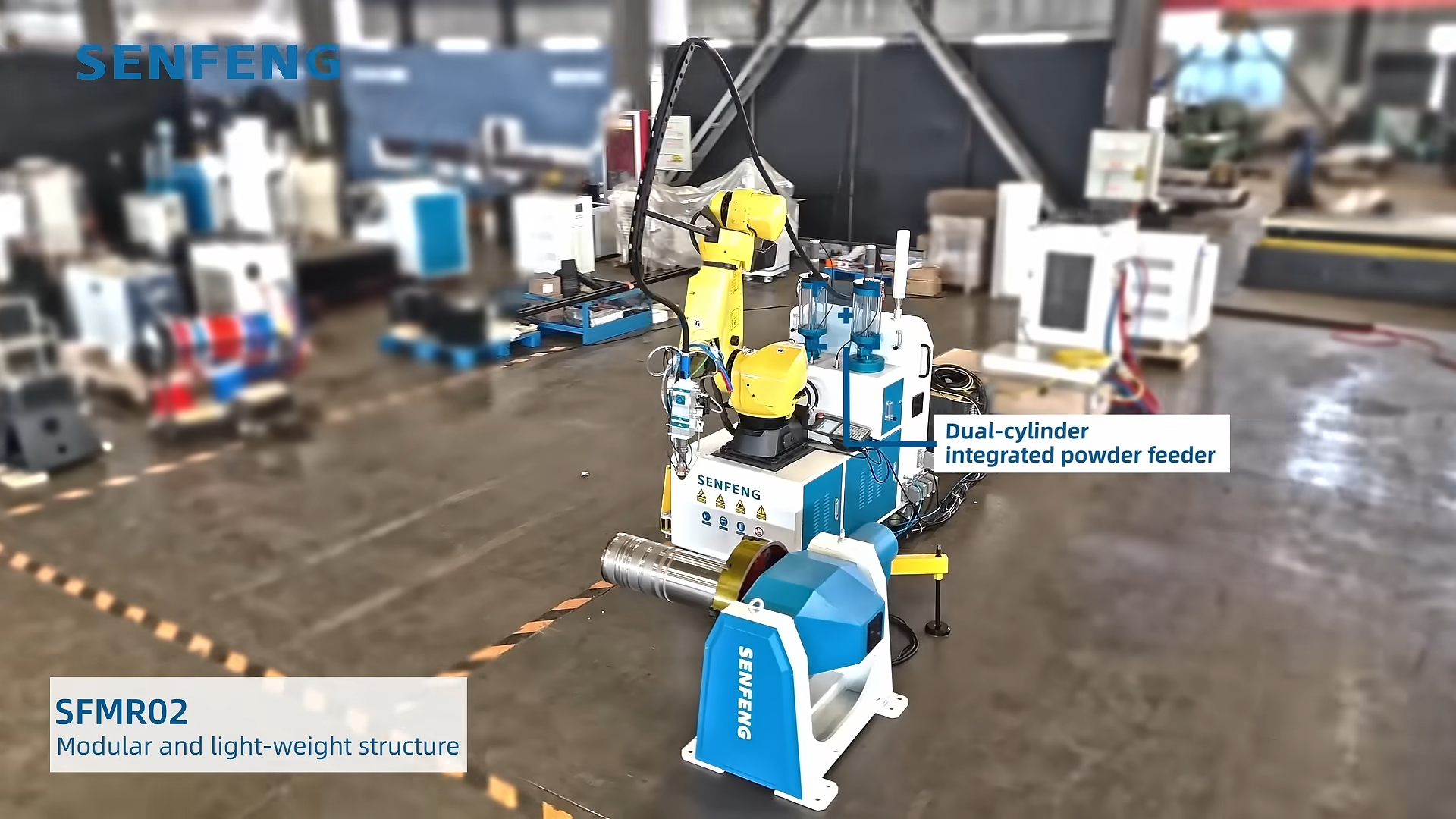 SFMR02 — мобильный лазерный наплавочный комплекс 6 кВт на базе робота M-10iD/12. Работает прямо на объекте: быстро разворачивается, после завершения демонтируется и переезжает на новую площадку. Наплавляет валы, криволинейные и фасонные детали. Толщина слоя 0,1–1,5 мм, разбавление менее 5%, использование порошка более 90%. Повышенная точность, низкое тепловложение, плотные покрытия без пор. Опция наплавки внутренних отверстий